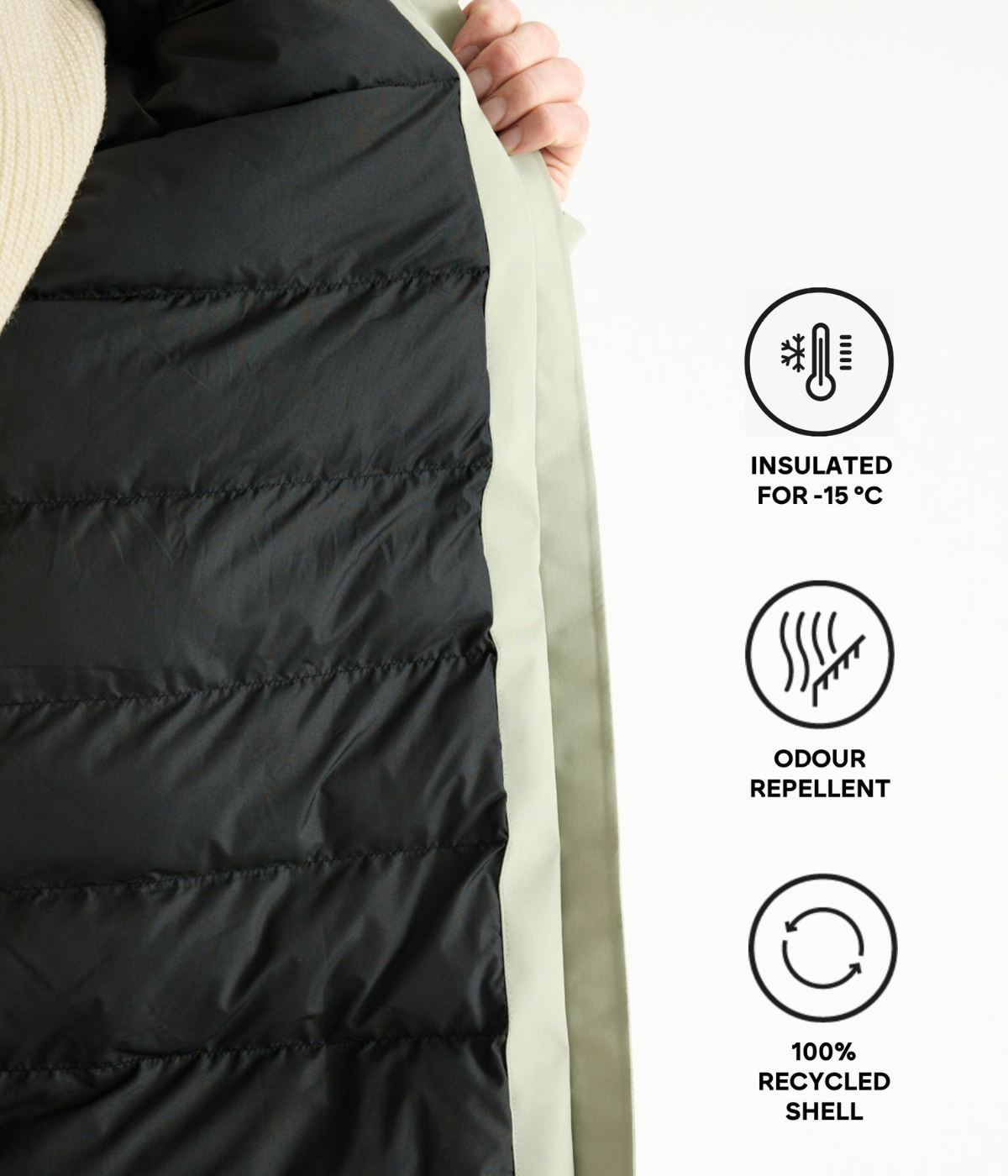 Shell & lining made 100% of recycled materials. The partly bio-based, recycled padding material keeps you warm all the way down to -15°, while technological properties in the fabric in the lining help with repelling odours.
