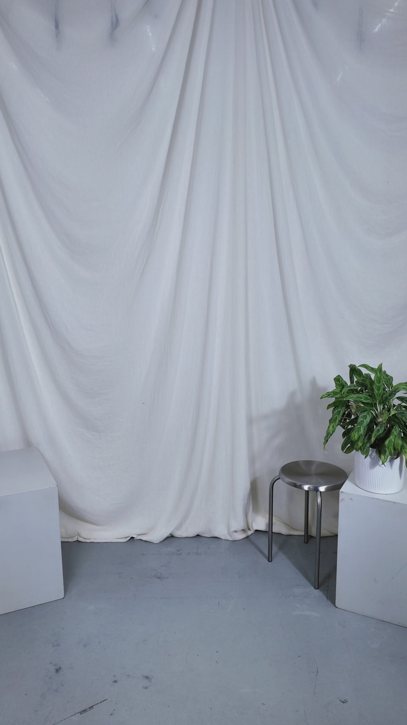 Two people sitting on a stool in a studio setting with photography equipment.