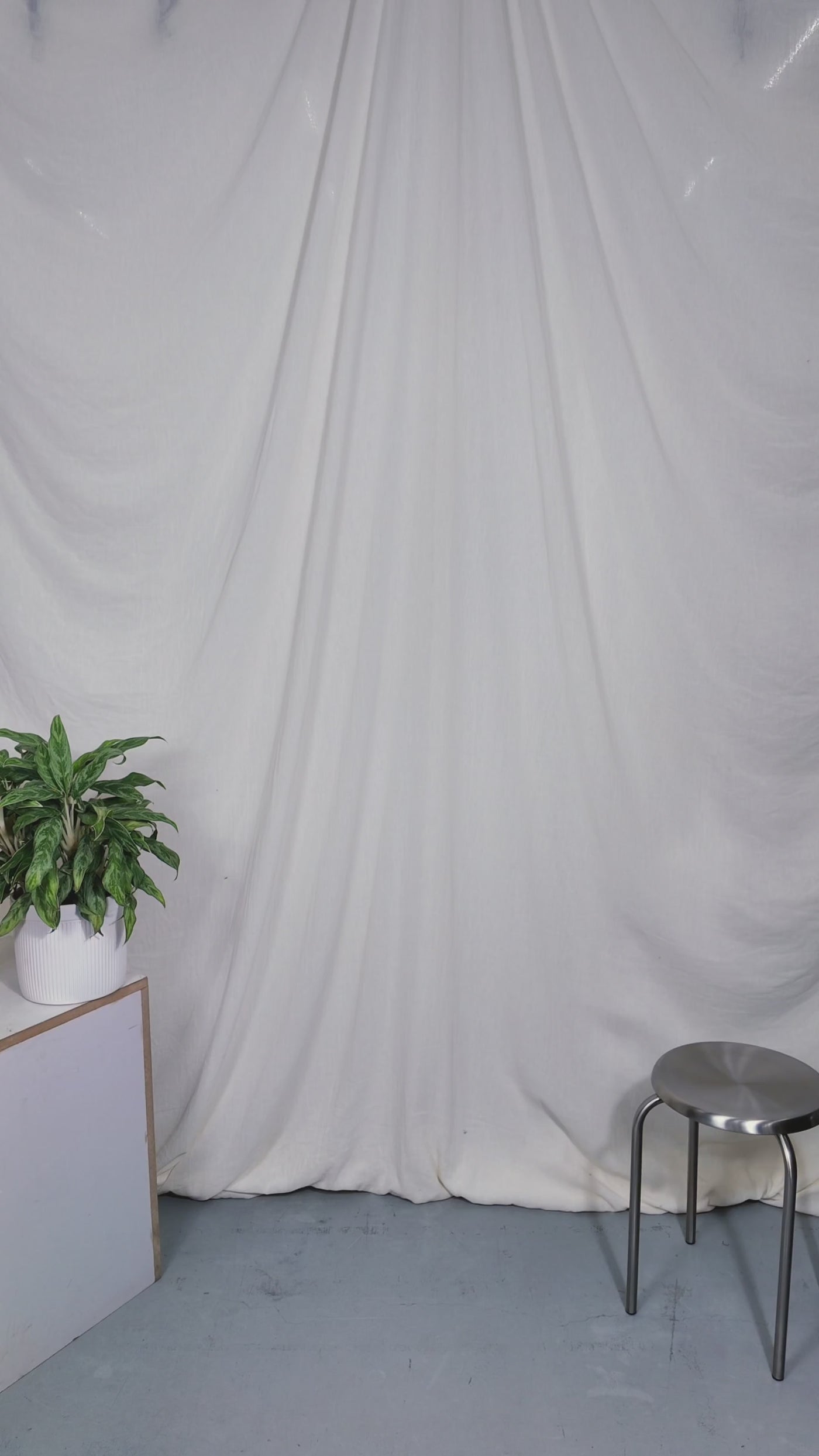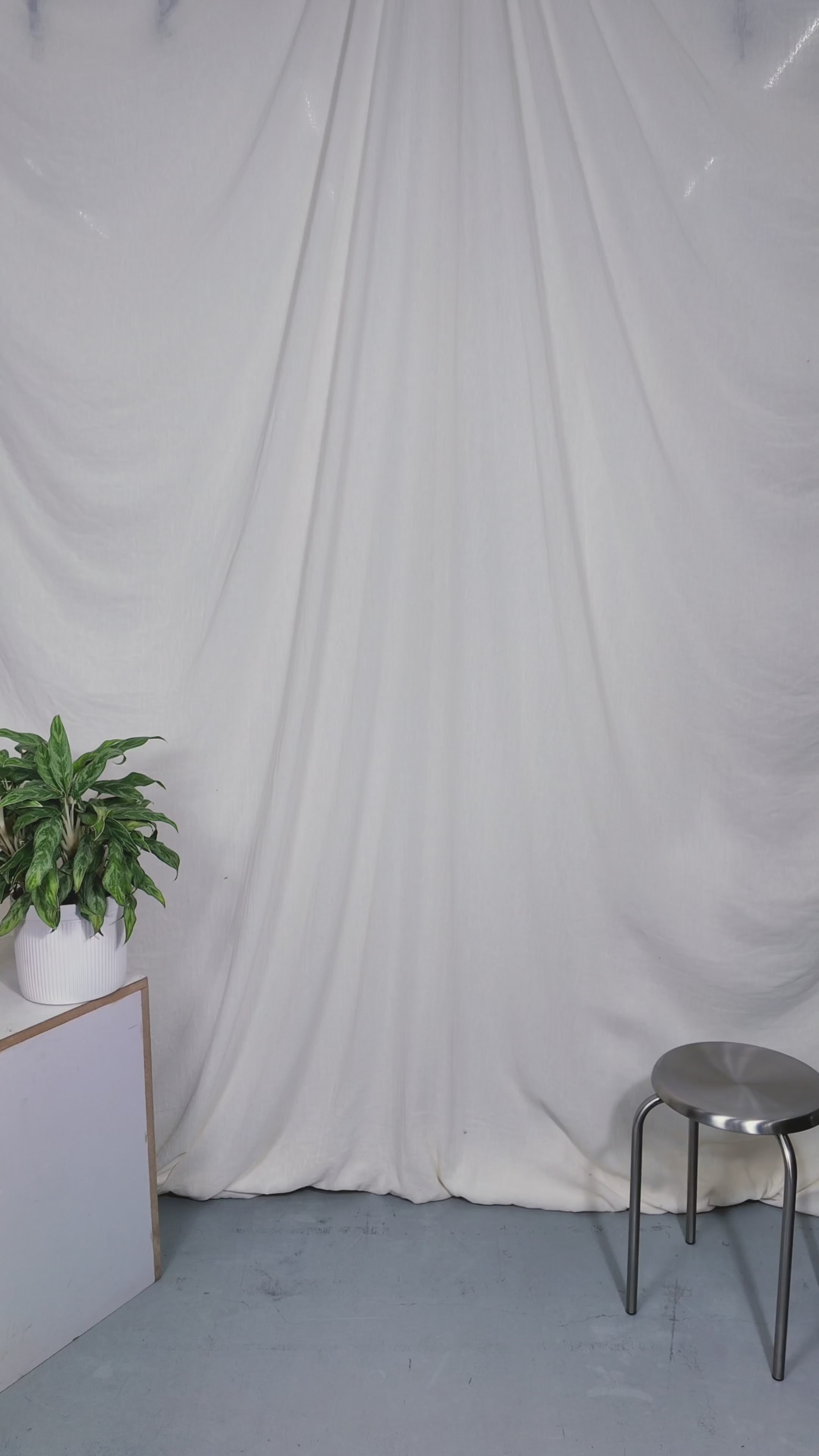 Two people sitting on a stool in a studio setting with photography equipment.