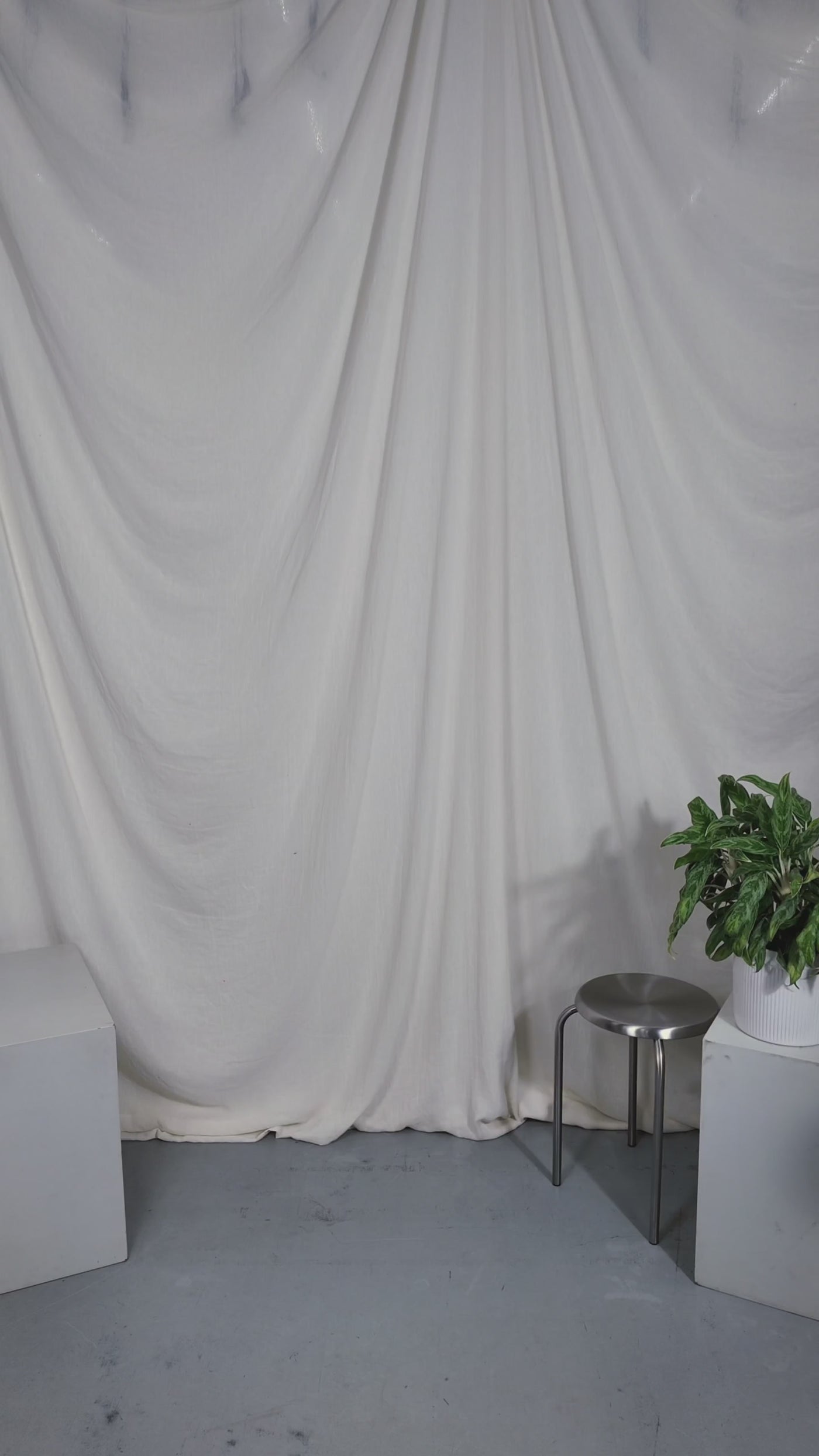 Two people sitting on a stool in a studio setting with photography equipment.