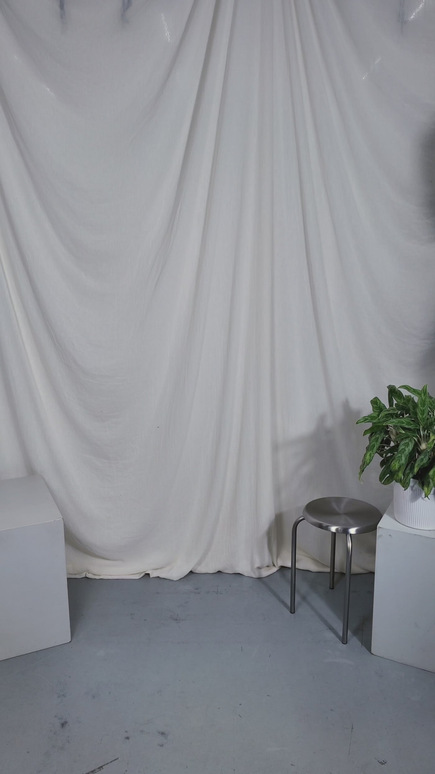 Two people sitting on a stool in a studio setting with photography equipment.