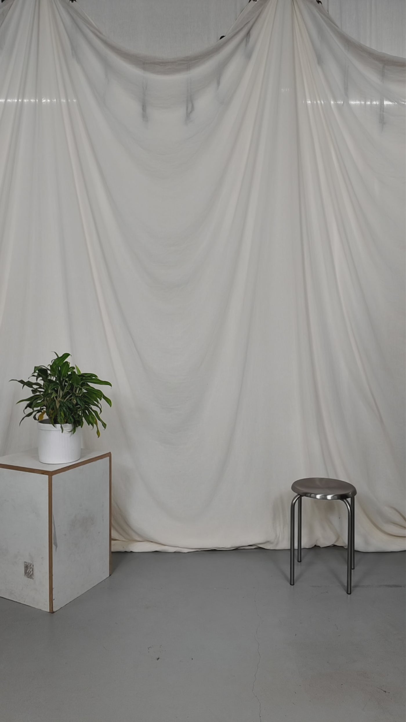 Two people sitting on a stool in a studio setting with photography equipment.