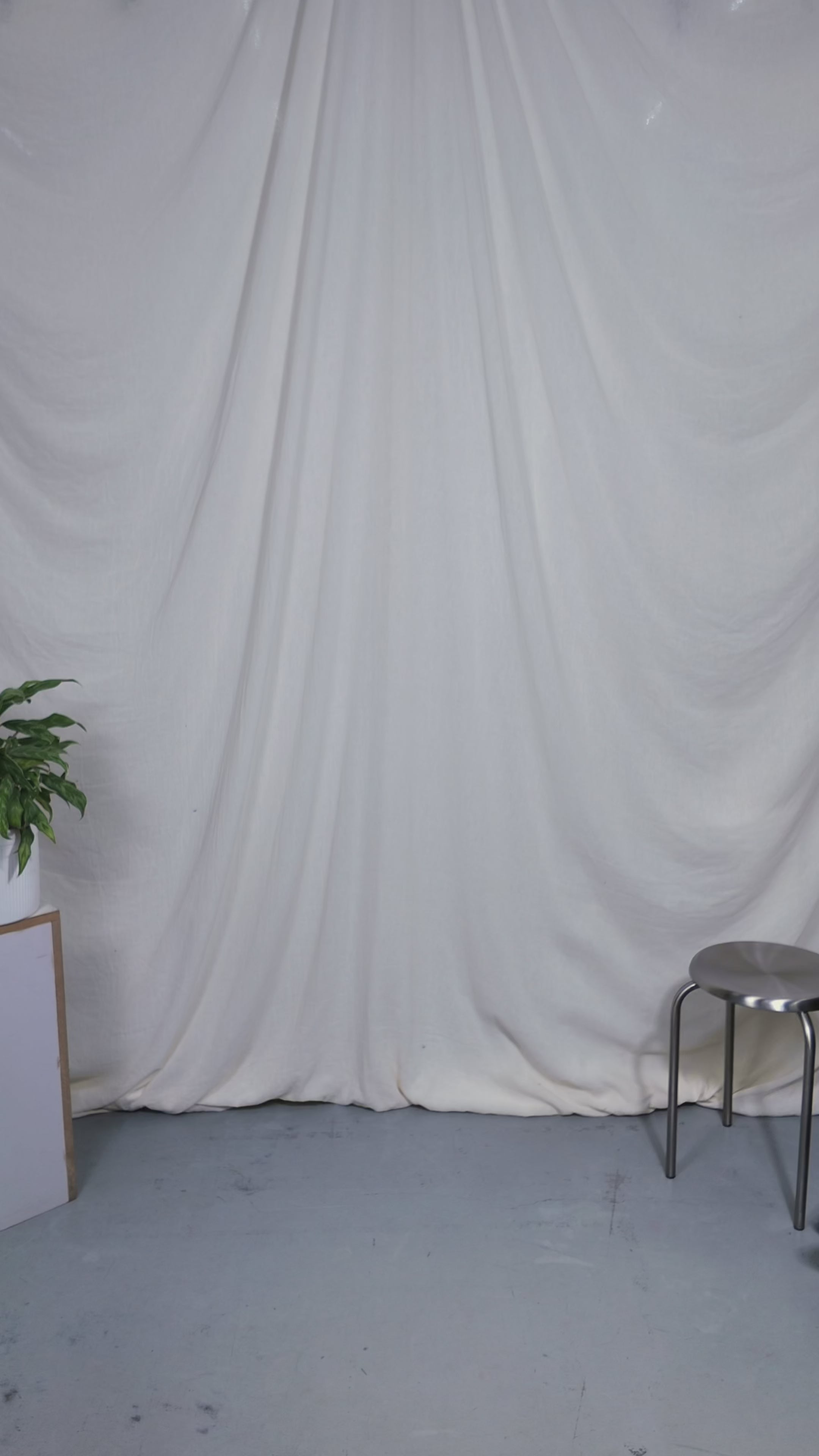 Two people sitting on a stool in a studio setting with photography equipment.